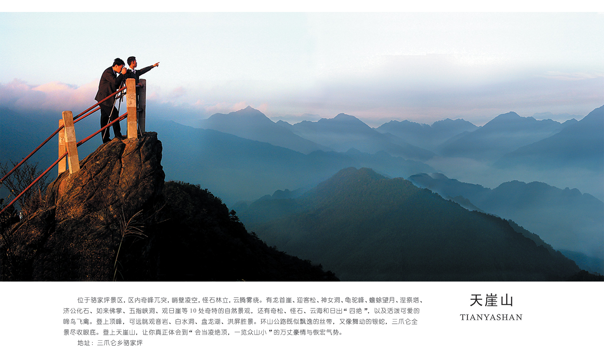 位于骆家坪景区,区内奇峰兀突,峭壁凌空,怪石林立,云腾雾绕。有龙首崖、迎客松、神女洞、龟驼峰、蟾蜍望月、涅祭塔、济公化石、如来佛掌、五指峡洞、观日崖等10处奇特的自然景观,还有奇松、怪石、云海和日出“四绝”,以及活泼可爱的啼鸟飞禽。登上顶峰,可远眺观音岩、白水洞、盘龙湖、洪屏胜景。环山公路既似飘逸的丝带,又像舞动的银蛇,三爪仑全景尽收眼底。登上天崖山,让你真正体会到“会当凌绝顶,一览众山小”的万丈豪情与恢宏气势。