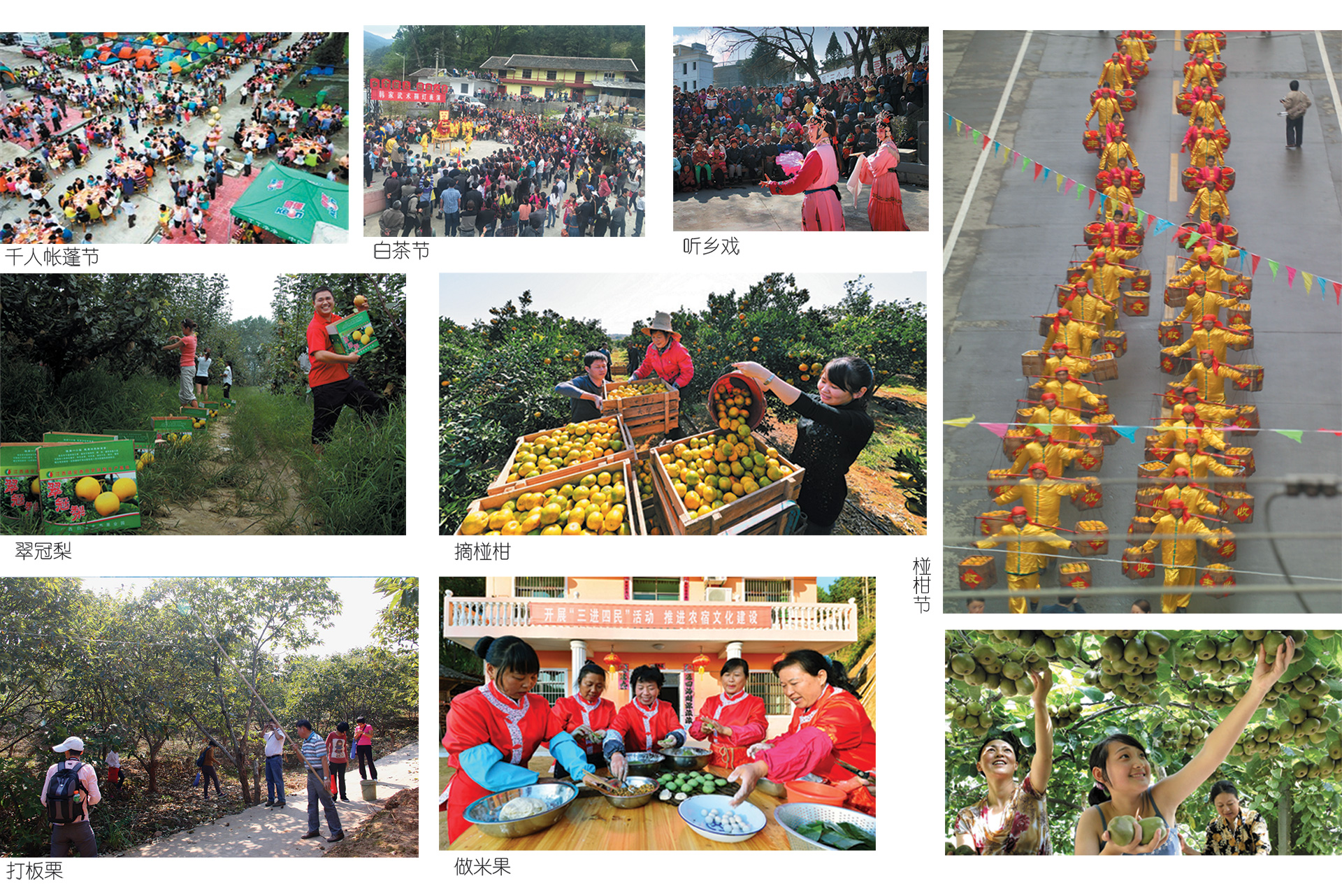 蓝天碧水间,春踏万亩油菜、百里杜鹃,夏赏万亩紫薇,秋摘万亩皇菊,冬有傲霜寒梅…… 白墙黑瓦里,吃地方土菜、看马灯船灯韩家拳、学钟家少林拳、做艾饼、尝客家果脯、磨豆腐、踩高跷…… 欢声笑语中,白崖山住云端看杜鹃、九岭尖穿越、西岭云中梯田、西头吕阳洞溯溪、和缘摘草莓、火龙果、古楠吃杨梅、宝峰葡萄沟、仁首蓝莓园、香田翠冠梨、十万亩优质椪柑……